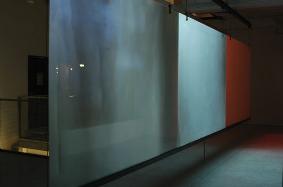 “...The Canicule in France was one of these extraordinary weather events. Charged with significance beyond the facts of a summer heat wave, the memory of the phenomenon became emblematic of a period of catastrophic history, reflecting the anxieties of western cultures teetering on the brink of a new, uncertain world orderThe images in Nira Pereg’s Canicule (2004) amplify this confusion. Scenes of celebration seem to sit side by side with moments of profound gloom. There is an elegiac quality in the rhythm of her editing - the slowed figures, repeated scenes, long fades and stretched, bellowing voices all memorialise the action. Though looped, there is a definitive moment when all three projections show only the red background and digital rain. This marks a beginning or end and subsequent fades carry the suggestion of chapters opening and closing within a remembered narrative. We remain uncertain, however, as to what exactly is unfolding in the situation before us. After a while, it is the hypnotic rhythm of the images, the reflected light and the darkness that holds us.”